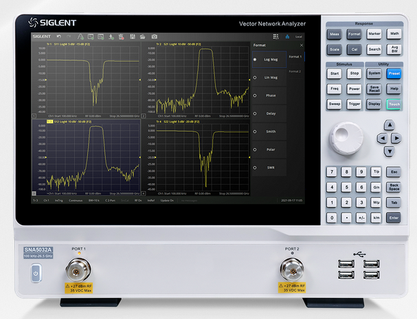 除開外觀設計,其先進的用戶界面,配合上12.1英寸超大觸摸屏與外接的鼠標和鍵盤,讓工程師能更快的添加或刪除窗口,通道和跡線。SNA5000A支持在多個窗口下,添加多條跡線進行S參數測量。并且測量結果,可以多種數據格式顯示,如 Log Mag,Lin Mag,Phase,Delay,Smith,SWR,Polar等,可以方便快捷地分析被測物的傳輸系數,反射系數,駐波比,阻抗匹配,相位,延時等參數。